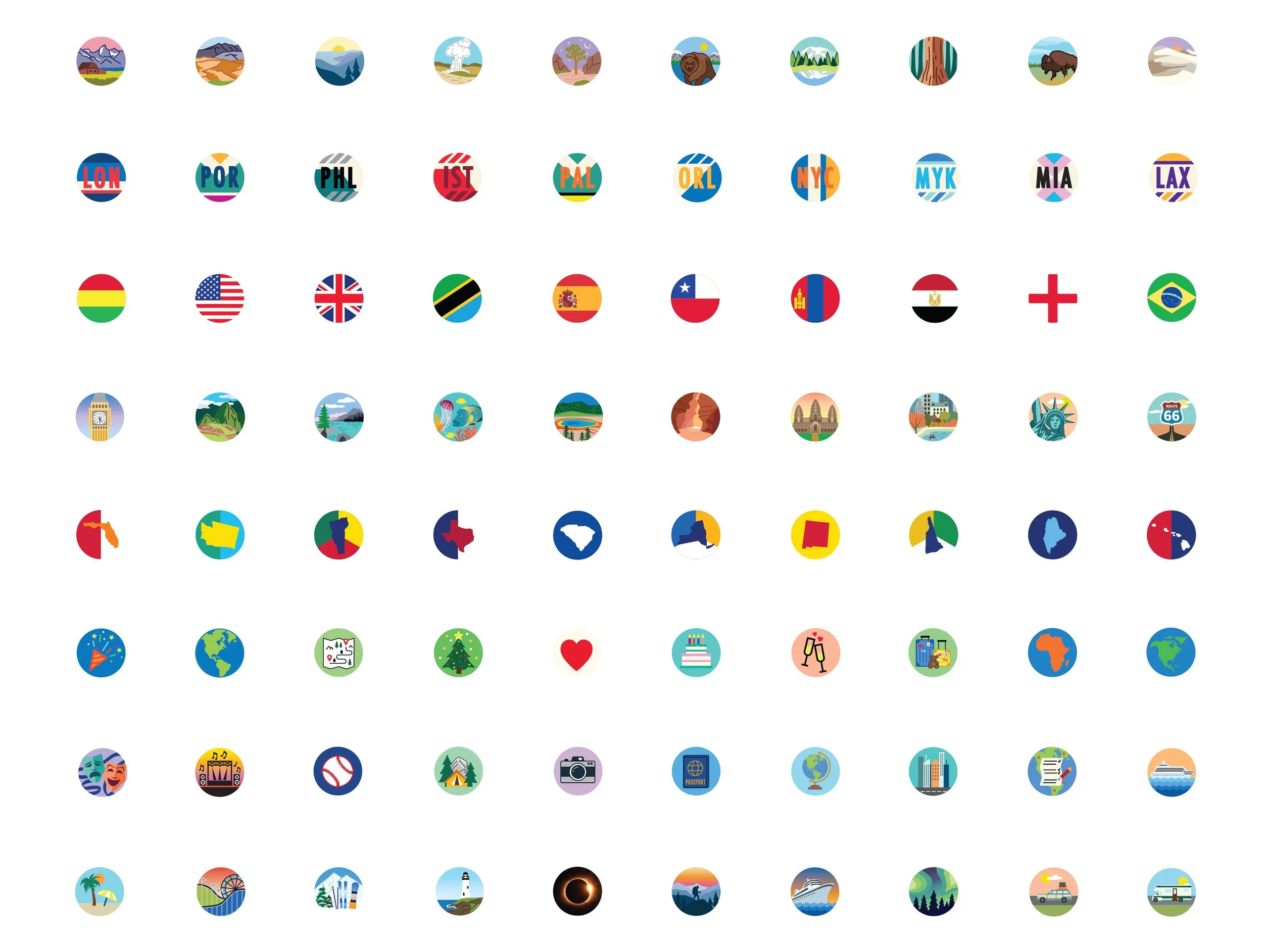 In 2022, I was tasked with re-designing The Wander Club’s hero product–a new travel token. One that is unique, colorful, collectable and of course will sell like hot cakes! The shape was to change also. Originally a washer shape, the token had to remain light, stack easily, fit on a keychain and have enough surface area to create a design.